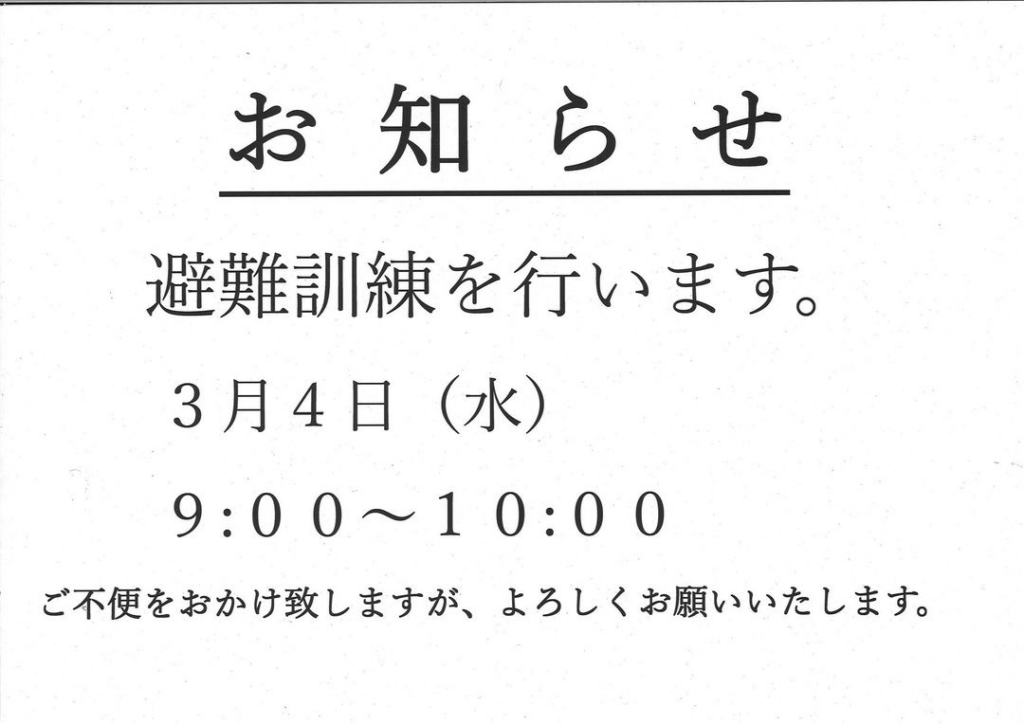 ホームLINE LINE-R8/2/20 2026-02-26 [おしらせ〛避難訓練を3月4日(水)の9:00~10:00に行います。 LINE VOOM版はこちら(フォローすると新規投稿時に通知が届きます)https://page.line.me/702xtwvl/media/1131123431952396