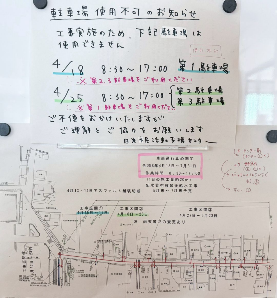 センター周辺の道路工事による通行止め、使用できる駐車場についてのお知らせ📢